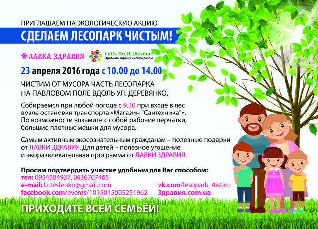 Приглашаем присоединиться к Всеукраинской экологической акции "Зробимо Україну чистою разом". Поддерживая эту акцию, ЛАВКА ЗДРАВИЯ организовывает уборку части Харьковского Лесопарка вдоль ул. Деревянко. Приглашаем жителей Павлова Поля и просто экосознательных Харьковчан и гостей города присоединиться и внести свой вклад в чистоту города. Акция "Сделаем Лесопарк чистым" будет проходить 23 апреля 2016 года с 10.00 до 14.00. Подробности смотрите на картинке.