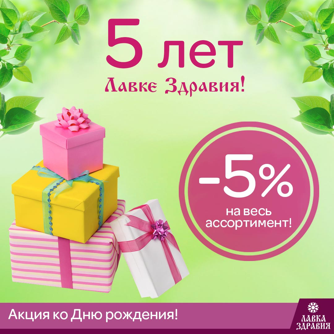 В честь 5-летнего юбилея только 15 ОКТЯБРЯ Лавка Здравия ДАРИТ нашим любимым покупателям скидку 5% ПЛЮС к Вашему дисконту на весь ассортимент натуральной продукции в сети магазинов Лавка Здравия в Харькове и на сайте.